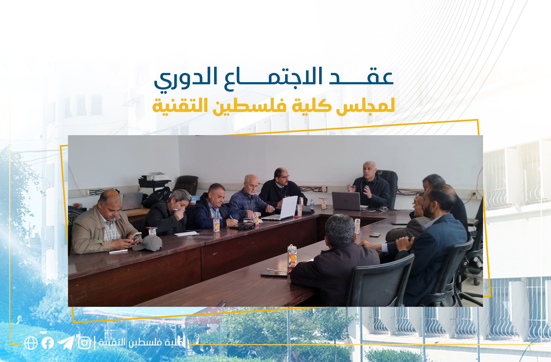 عقد مجلس كلية فلسطين التقنية – دير البلح اجتماعه الدوري برئاسة عميد الكلية د. هيثم عايش، وبحضور نواب العميد والسادة رؤساء الأقسام الأكاديمية، وذلك للوقوف على آخر المستجدات الأكاديمية ووضع خطط العمل للفترة المقبلة والتي شملت: